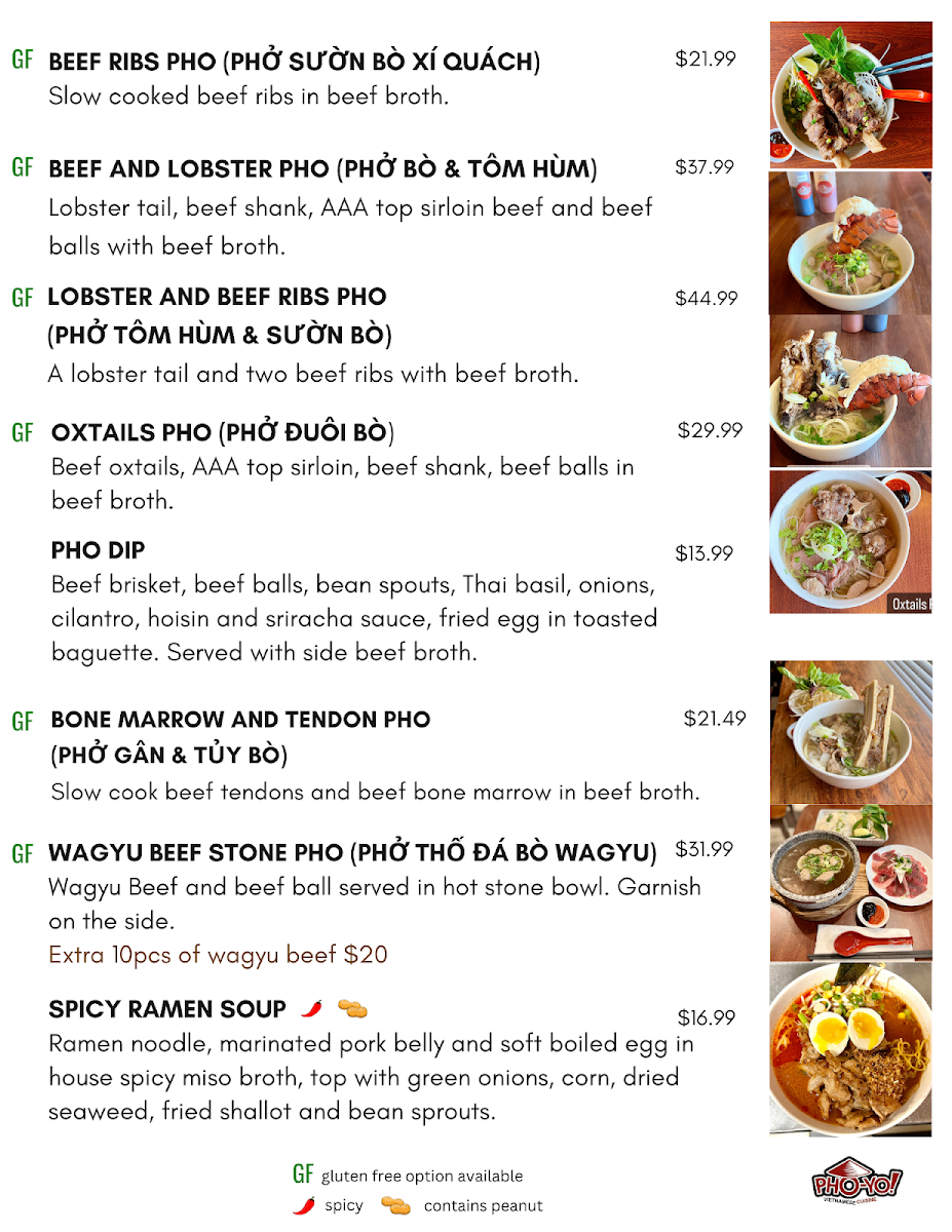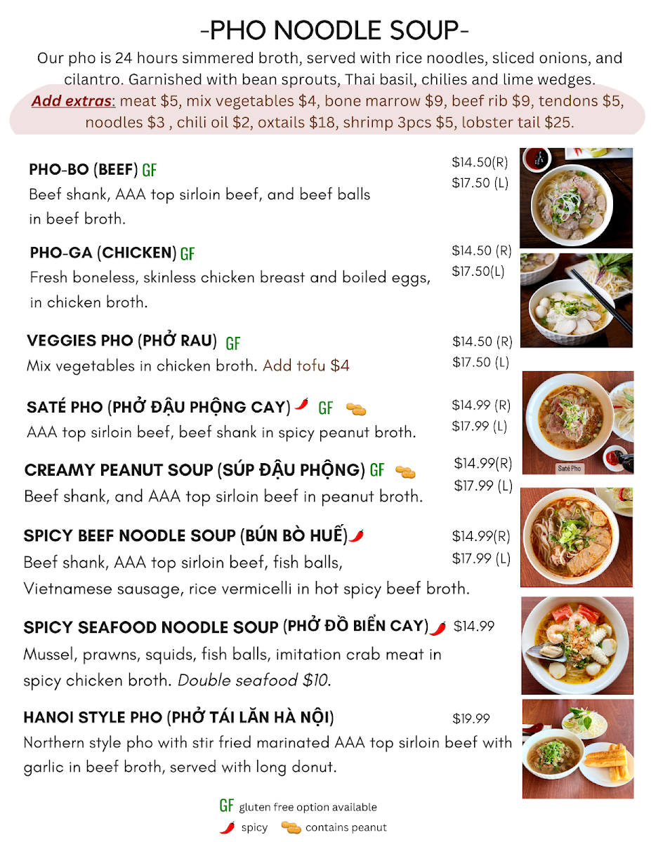 Beef shank and AAA top sirloin beef in a steaming hot peanut broth, served with rice noodles, sliced onions, green onions, and cilantro, garnish with bean sprouts and Thai basil. (Broth contain chicken)