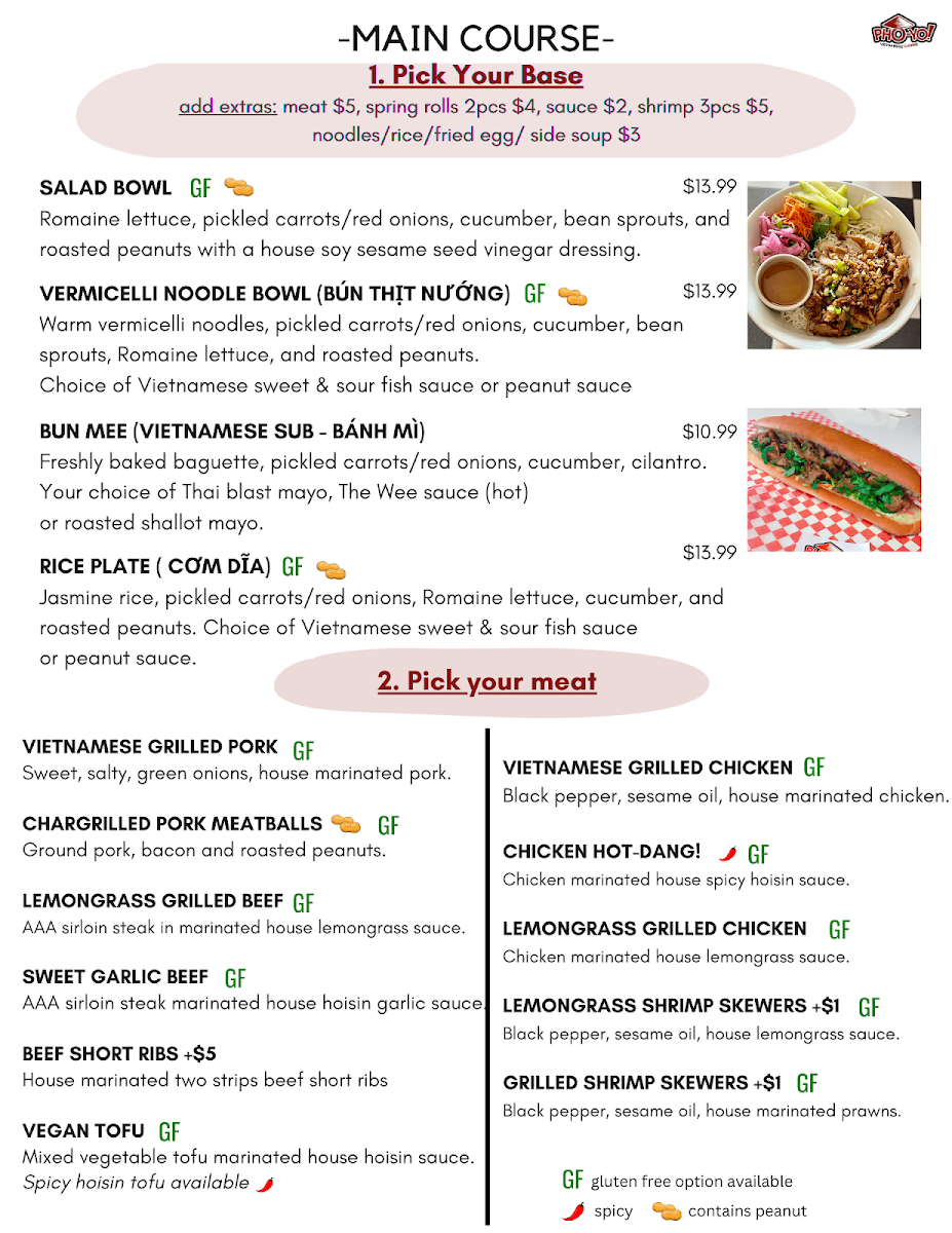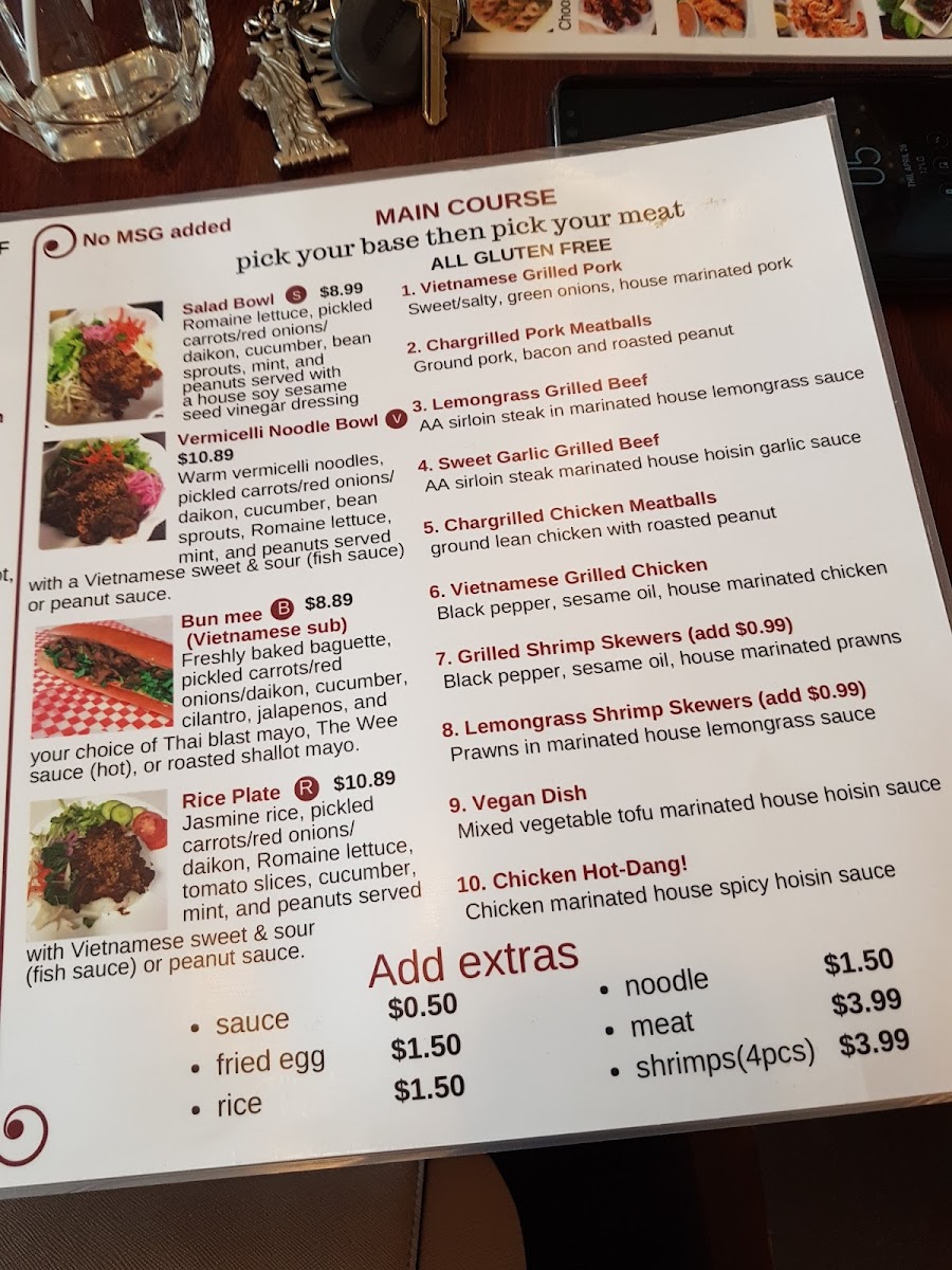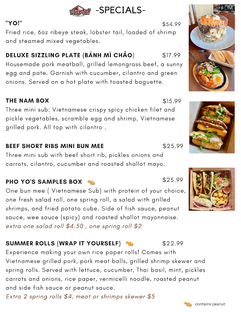 Comes with 1 bun mee ( Vietnamese Sub) with protein of your choice, 1 fresh salad roll with protein of your choice, 1 spring roll, 1 salad with grilled shrimps and fried potato cube. Sauces included fish sauce, peanut sauce, roasted shallot mayonnaise and wee sauce (spicy).