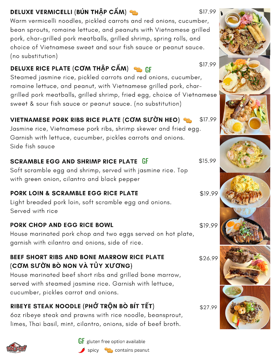 Steamed jasmine rice, pickled carrot, and red onions, cucumber, romaine lettuce, and peanuts. Comes with Vietnamese grilled pork, char-grilled pork meatballs, grilled shrimp, fried egg. NO SUBSTITUTIONS