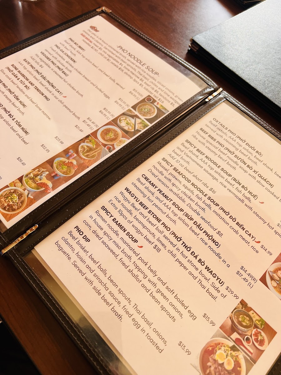 6oz ribeye steak and prawns with rice noodle, beansprout, limes, Thai basil, mint, cilantro, onions. Served with side of beef broth.